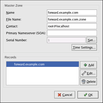 • File Name — File name of the DNS database file, relative to /var/named. It is preset to the domain name with .zone appended to it.