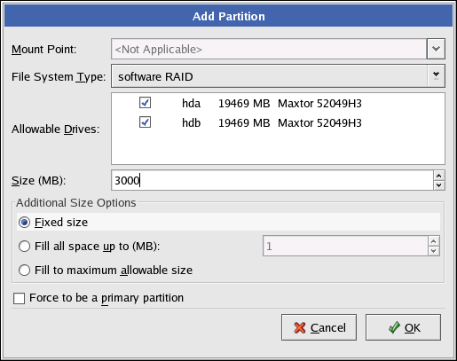 Repeat these steps to create as many partitions as needed for your RAID setup. Notice that all the partitions do not have to be RAID partitions. For example, you can configure only the /home partition as a software RAID device.