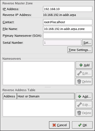 9. Reverse Address Table — List of IP addresses within the reverse master zone and their hostnames. For example, for the reverse master zone 192.168.10, 192.168.10.1 can be added in the Reverse Address Table with the hostname one.example.com. The hostname must end with a period (.) to specify that it is a full hostname.