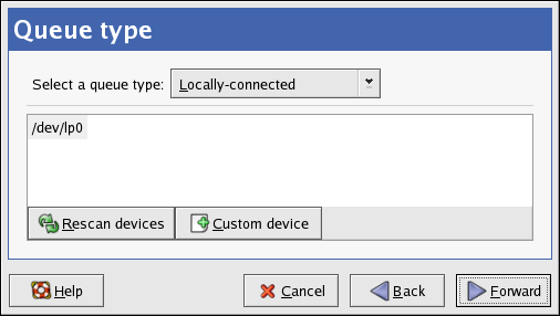 After clicking Forward, Figure 24-4 appears. Select Locally-connected from the Select a queue type menu, and select the device. The device is usually /dev/lp0 for a parallel printer or /dev/usb/lp0 for a USB printer. If no devices appear in the list, click Rescan devices to rescan the computer or click Custom device to specify it manually. Click Forward to continue.
