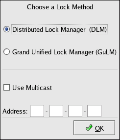 2. For a new configuration, a Lock Method dialog box is displayed requesting a choice of either the GULM or DLM lock method (and multicast address for DLM).