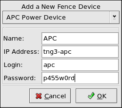 1. Select the member for which you want to configure a power controller connection and click Manage Fencing For This Node. The Fence Configuration dialog box is displayed as shown in Figure 3-8.